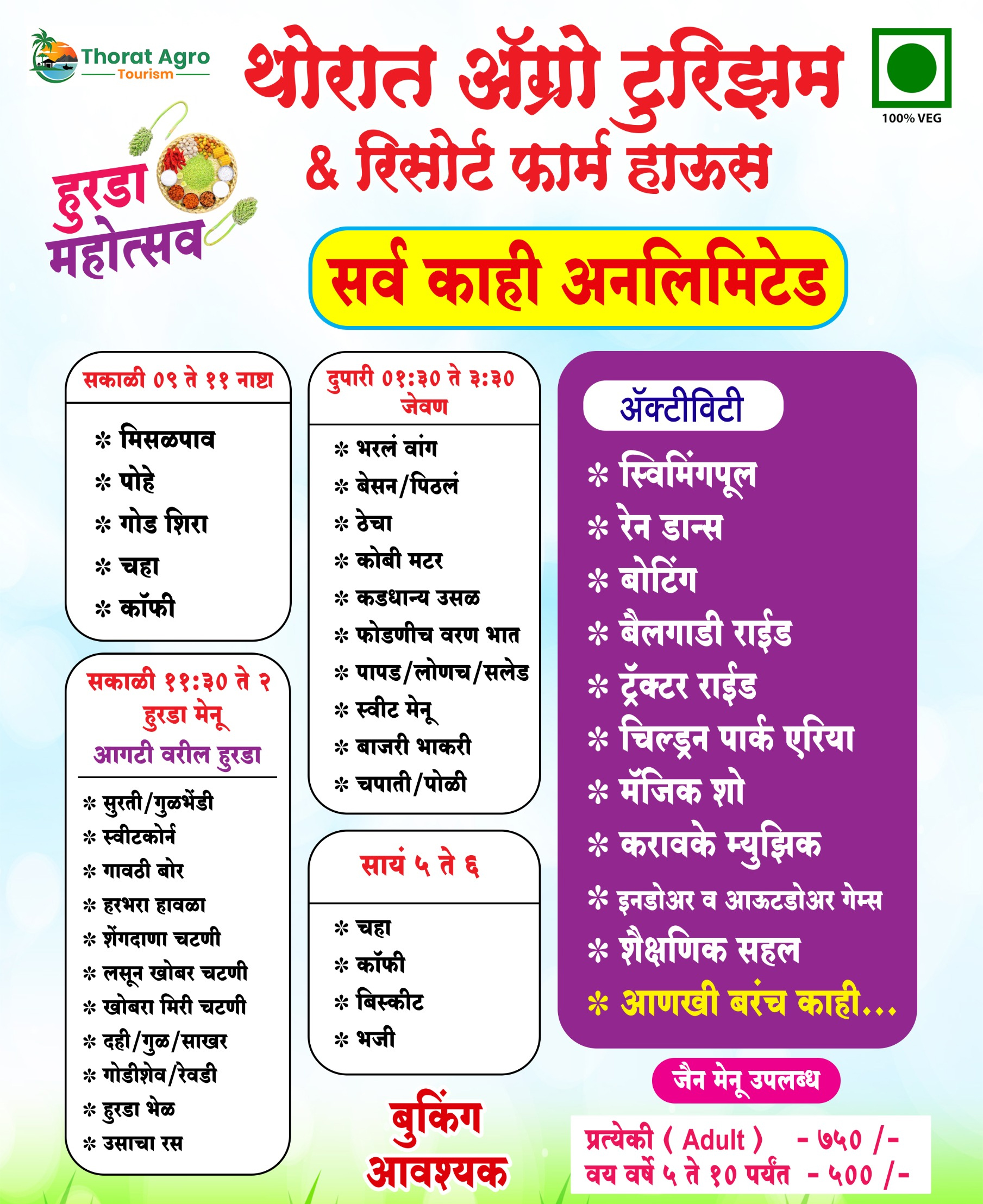Welcome to Thorat Agro Tourism & Resort Farm House, your ultimate destination for authentic rural experiences through Agri Tourism! Nestled amidst nature, we offer a perfect escape from city life where you can reconnect with the roots of Indian farming culture. Our farm-based tourism brings you closer to the earth with exciting activities like bullock cart rides, organic farming, harvesting, tractor rides, and traditional Maharashtrian food.